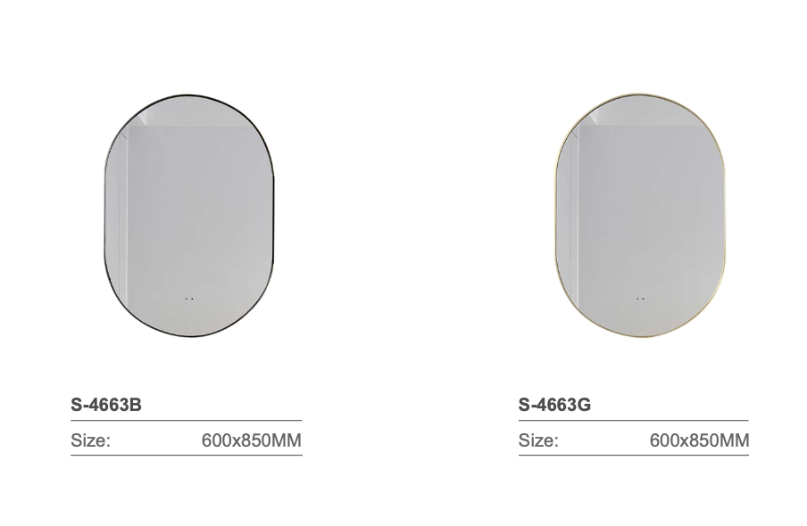 Espejo HD de 5mm libre de cobre con diseño ovalado e iluminación LED perimetral indirecta (retroiluminado). El diseño se caracteriza por su marco metálico delgado que resalta la silueta elegante del espejo mientras proporciona una luz ambiental suave.